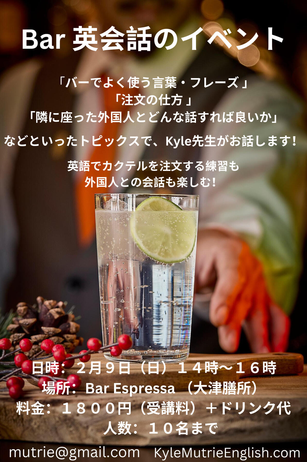 定員は10名なので、ご興味のある方はお早めにご予約ください。日時:2月9日(日) 14時〜16時 (16時以降は通常のバーのメニュー金額となりますが、講師含め外国人の友人たちは残りますので、もしよろしければご参加ください)場所:Bar Espressa (JR膳所駅・京阪膳所駅から徒歩5分 ➤ 〒520-0802 滋賀県大津市馬場1丁目7−17)料金:1800円 (受講料)+ドリンク代 (カクテル1杯以上)人数:10名まで英語のレベル:ビギナーの方も大歓迎です。ぜひお気軽にご参加ください。「英語を楽しく使ってみよう!」というのがテーマです。講師も外国人の友人たちもみんな日本語を話せますので、どうぞご安心ください。お渡しするもの:バーで使える英語表現についてのプリント・発音のオーディオファイル